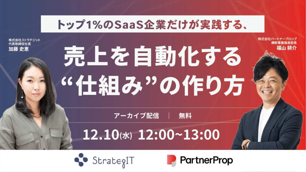 本イベントでは、パートナービジネスのプロフェッショナルである株式会社ストラテジットの 加藤 史恵氏と弊社の福山 耕介が登壇。直販依存から脱却し、代理店売上を最大化させるための具体的な「仕組み」について、成功企業の事例を交えながら徹底解説します。