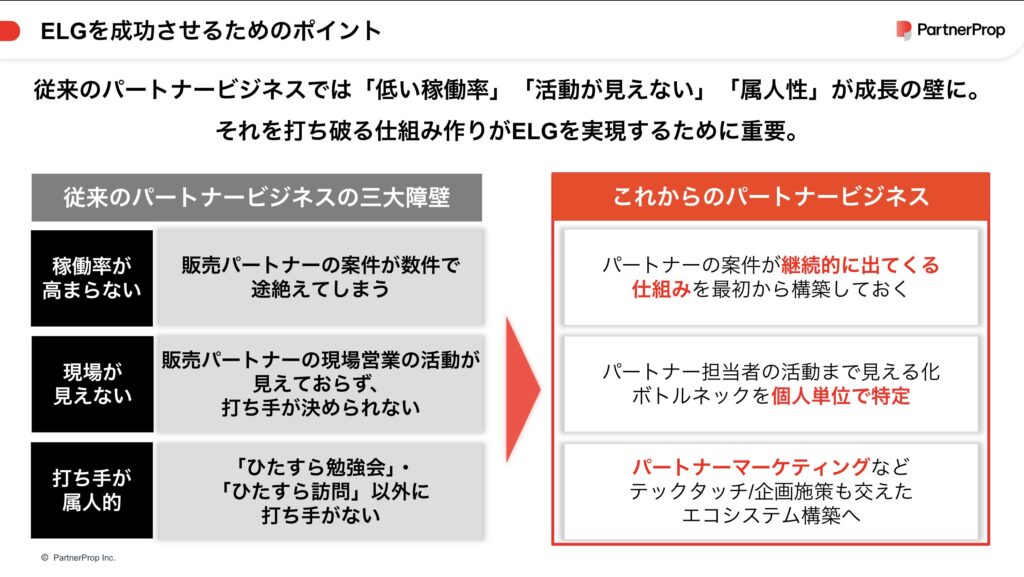 販売パートナーによるビジネス拡大を「感覚」ではなく「構造」として捉え直し、営業現場に成長の再現性をもたらすこと——それが「ELG MODEL」の核心です。