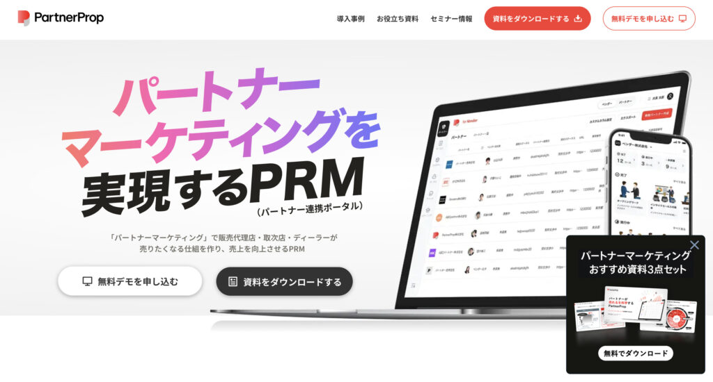 PartnerPropは日本発のPRMツールで、スタートアップからエンタープライズまで幅広い企業で導入が進んでいます。特徴は、日本市場に特化した使いやすさと、同社が提唱する「パートナーマーケティング」支援の充実です。単なるシステム提供に留まらず、パートナー戦略の立案や運用ノウハウの提供などコンサルティング要素も含めて伴走してくれる点が心強いでしょう。機能面では、パートナーポータル、案件管理、Eラーニング、コミュニケーション(チャット)、インセンティブ管理、レポーティングなどチャネル施策に必要な機能をオールインワンで備えています。