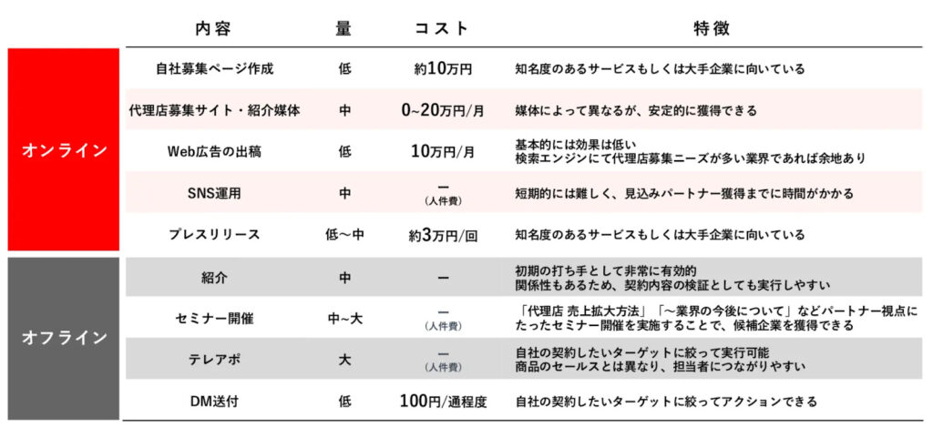 パートナーを開拓する手段は多岐にわたりますが、大きくオンライン施策とオフライン施策に分けることができます。それぞれにかかるコストや接点数の多寡、リードの温度感などの特徴があるため、自社の体制や商材に応じて適切な組み合わせを選定することが重要です。