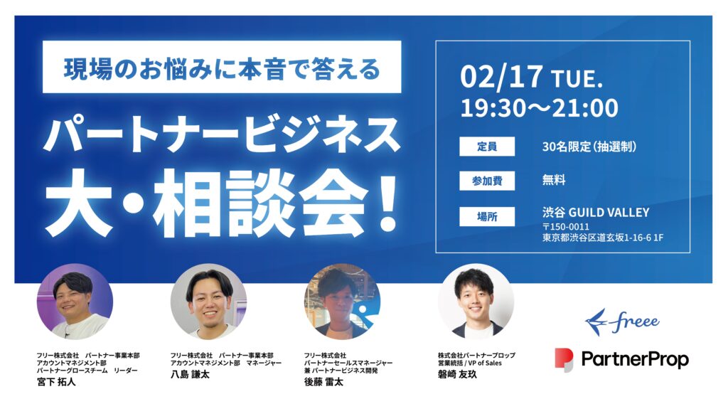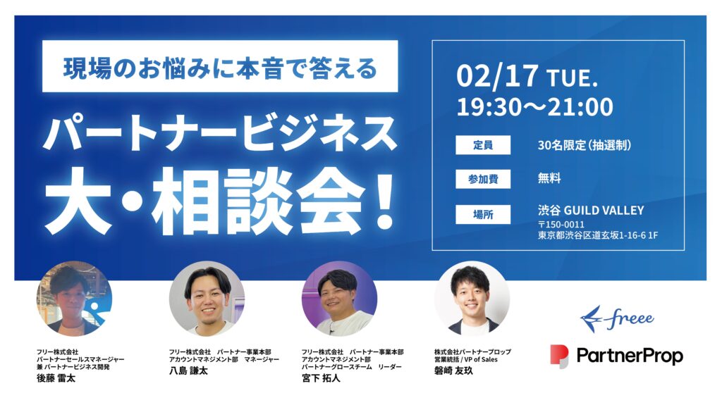 | 備考 | ・フリー株式会社及びパートナープロップの 同業他社様のご参加はご遠慮いただいております。予めご了承ください。 ・プライバシーポリシーは こちら をご覧ください |